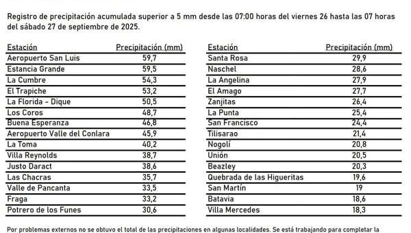 Vecinos De La Punta / 27 de setiembreLa ciudad de San Luis fue la más beneficiada con 59,7 mm. Le siguieron Estancia Grande con 59,5 mm y La Cumbre con 54,3 mm.En La Punta...