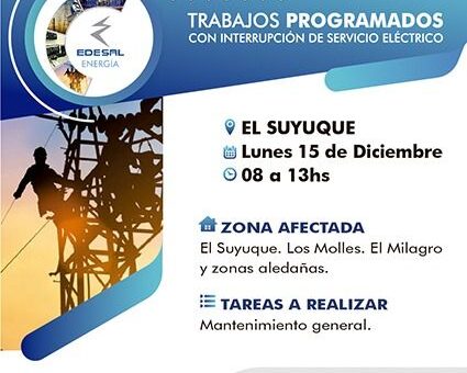 Atención vecinos El SuyuqueCorte del servicio eléctrico este Lunes 15 de DiciembreVecinos De La Punta / 13 de diciembreEl corte del servicio eléctrico previsto para este próximo lunes será de 08 a 13hsZONA AFECTADA:...