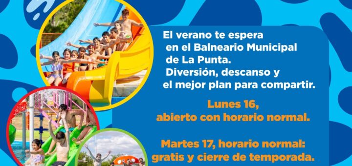 VECINOSDELAPUNTA.NET / 15 DE FEBREROEsta semana será el cierre de otra temporada del Parque Acuático de La Punta. Con diversas actividades, el lunes 16 se abrirá en el horario de 10:00 a 23:00 hs....
