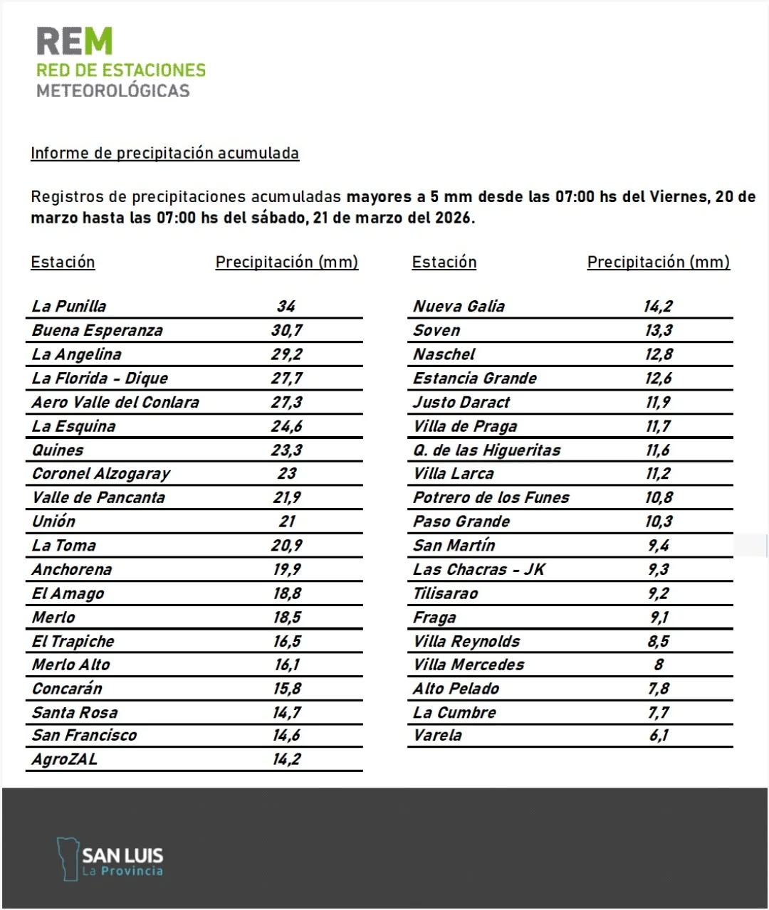 La Punilla y Buena Esperanza, con 34 y 30,7 mm respectivamente, registraron los indicadores más altos en cuanto a precipitaciones se refiere, según la Red de Estaciones Meteorológicas provinciales.