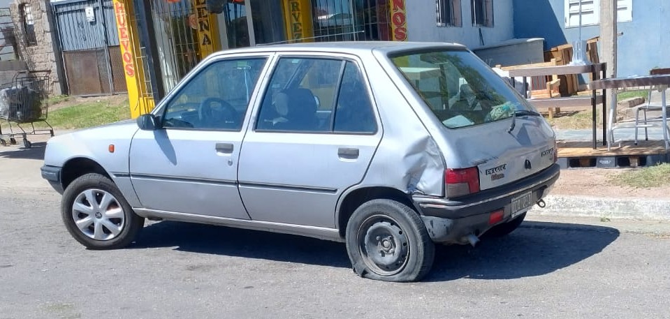 Producto del impacto de la moto, la rueda trasera izquierda del vehículo de porte mayor, explotó y el mismo sector del chasis quedo dañado.