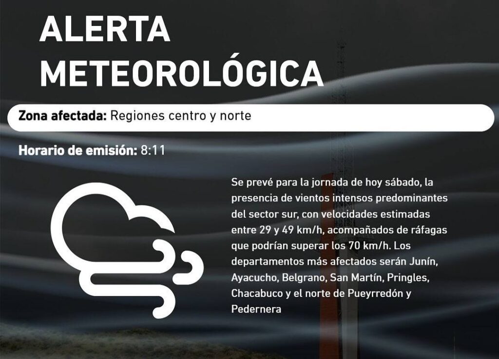 Se prevé para la jornada de hoy sábado, la presencia de vientos intensos predominantes del sector sur, con velocidades estimadas entre 29 y 49 km/h, acompañados de ráfagas que podrían superar los 70 km/h. Los departamentos más afectados serán Junín, Ayacucho, Belgrano, San Martín, Pringles, Chacabuco y el norte de Pueyrredón y Pedernera