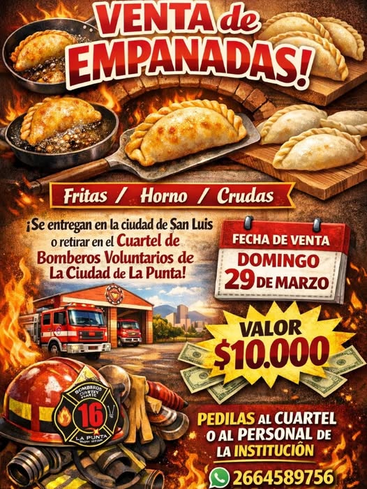 La propuesta incluye venta de empanadas fritas, al horno y también crudas, y podrán retirarse en el cuartel o coordinar entrega dentro de la ciudad de San Luis.