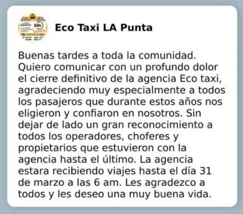 Eco Taxi comunicó que cierra la agencia. Lo hizo a través de sus redes sociales, agradeciendo el acompañamiento de toda la comunidad, como de los choferes que brindaron dicho servicio durante varios años.