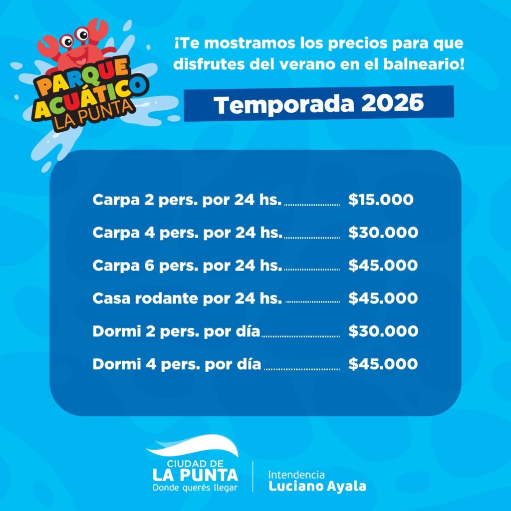 El Parque Acuático de La Punta, es uno de los puntos elegidos por vecinos, vecinas y turistas para pasar los días de calor con una infraestructura completa, piletas, juegos y toboganes, espacios de sombra, asadores, y mucho más.