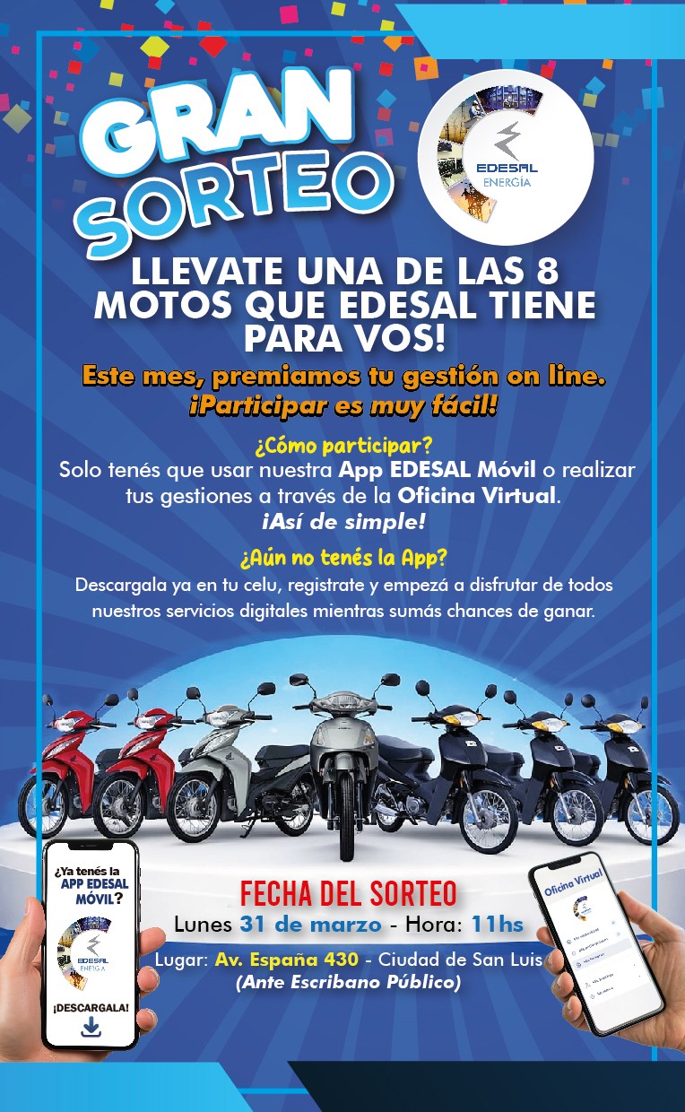 La empresa distribuidora de energía EDESAL lanzó una nueva propuesta para incentivar el uso de sus canales digitales: el sorteo de ocho motos entre los usuarios que realicen gestiones online durante el mes. La iniciativa busca premiar a quienes utilicen la App EDESAL Móvil o la Oficina Virtual para efectuar trámites y consultas, promoviendo así una gestión más ágil y sustentable.