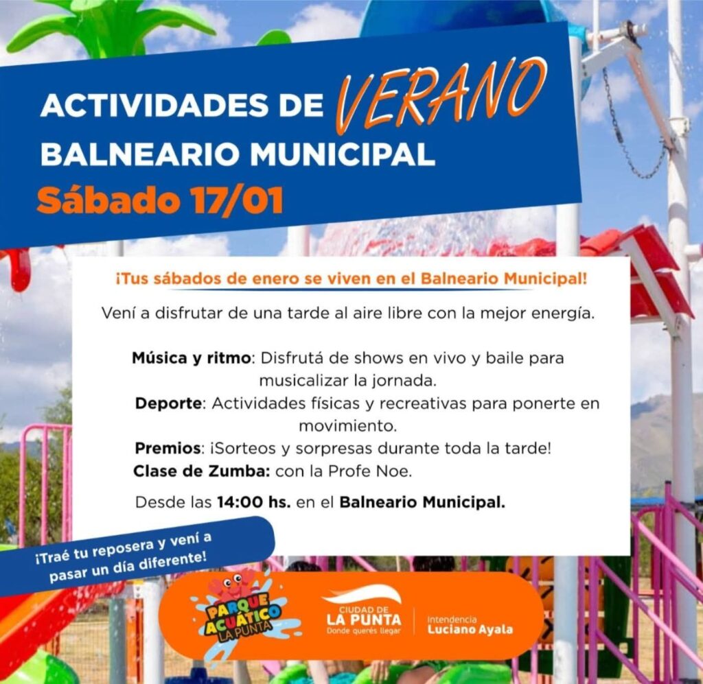 El balneario este sábado tendrá diversos actividades recreativas por info-vdlp · Publicada 17 enero, 2026 · Actualizado 17 enero, 2026 Vecinos De La Punta / 16 de eneroMúsica y ritmo. shows en vivo y baile.Deporte: Actividades físicas y recreativas.Premios: iSorteos y sorpresas durante toda la tarde!Clase de Zumba: con la Profe Noe.Desde las 14:00 hs. en el Balneario .