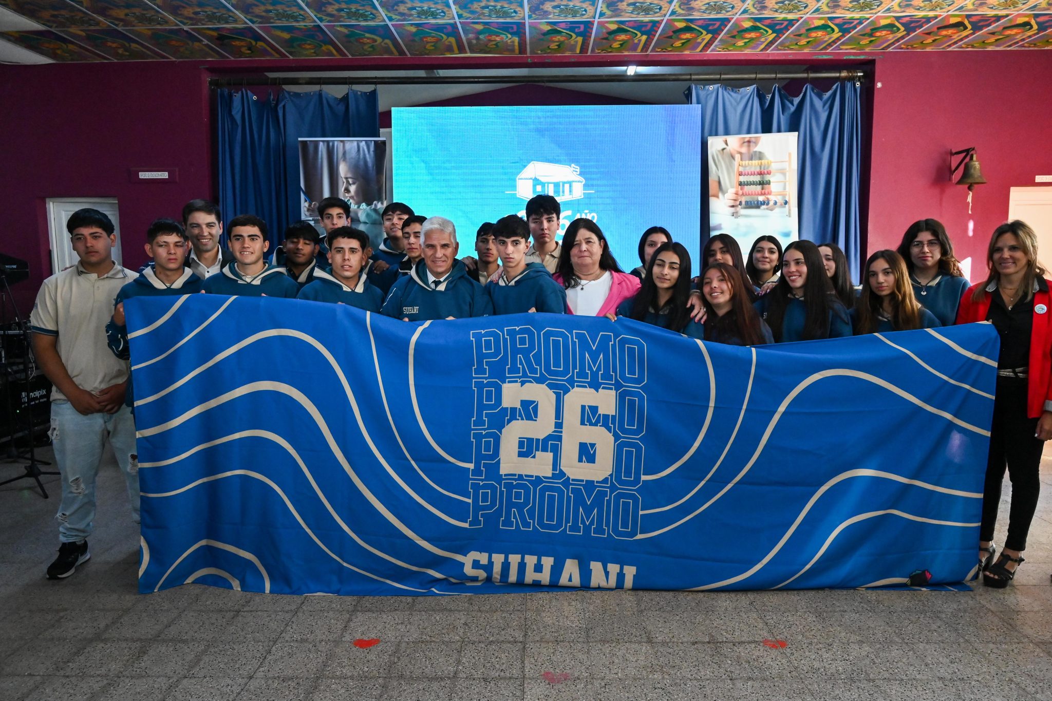 El acto también sirvió para dotar a la institución de material didáctico de los programas ‘Queremos Aprender’ y ‘Queremos Resolver’ y un kit con elementos deportivos. Antes de partir, Poggi dejó su saco para ponerse el buzo de la promoción SUHANI 2026 y posar con ellos para una foto.