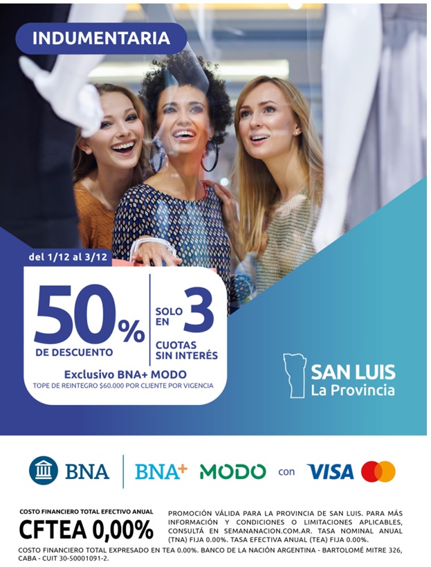 El Gobierno provincial y el Banco Nación ofrecen en diciembre una nueva promoción para la compra de indumentaria con un 50% de descuento, solo en tres cuotas sin interés. La iniciativa estará en vigencia lunes 1, martes 2 y miércoles 3 de diciembre, con un tope de reintegro de $60 mil por persona, utilizando las tarjetas de crédito Visa y Mastercard, a través de la aplicación Modo BNA+.