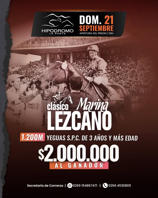 El próximo domingo 21 de septiembre, el Hipódromo La Punta abrirá sus puertas desde las 10:00 para vivir una de las carreras más esperadas del calendario: el Clásico Marina Lezcano.