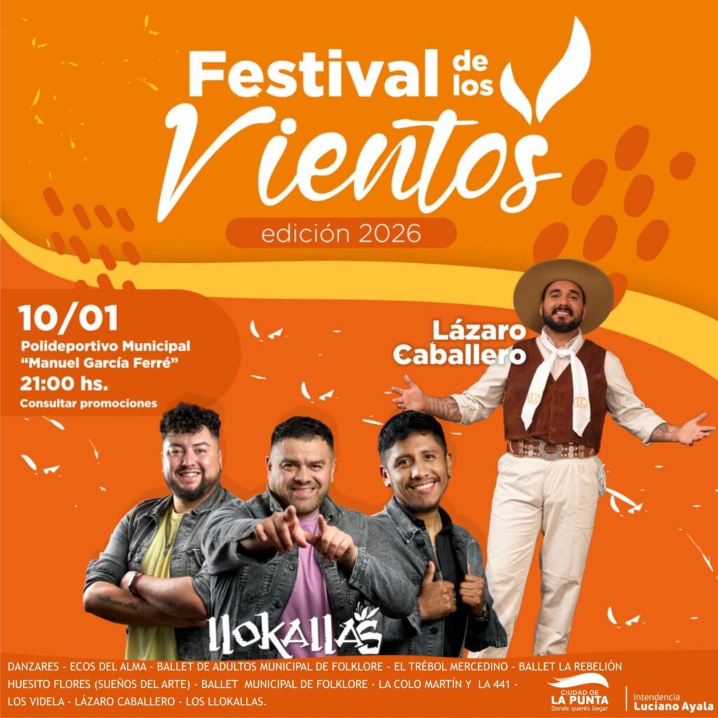 La Municipalidad de La Punta informó que el Festival de los Vientos se realizará el sábado 10 de enero, con las presentaciones de Los Hermanos Videla, Llokallas, Lázaro Caballero y los artistas locales El Trébol Mercedino, Huesito Flores/Sueños del Arte, La Colo Martin y la 441, y Ecos del Alma.