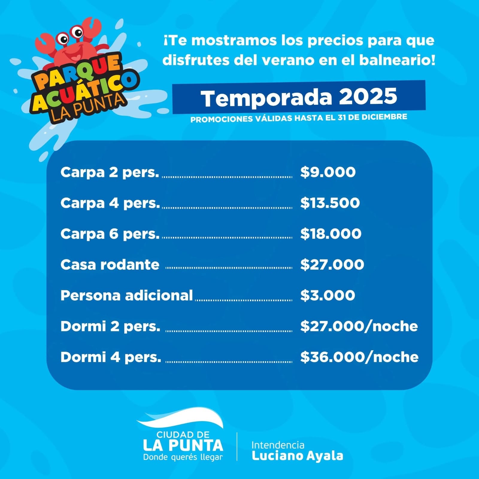 Por otro lado, el área de camping contará con las siguientes tarifas: carpa para dos personas $9.000, carpa para cuatro personas $13.500, carpa para seis personas $18.000, casa rodante $27.000, y persona adicional $3.000.