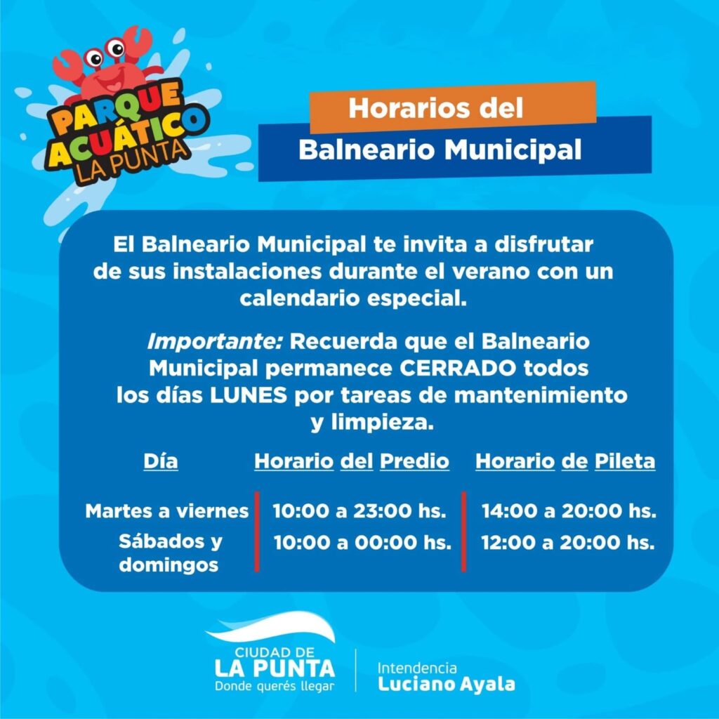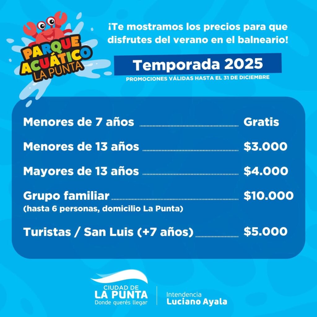La Municipalidad de La Punta informó los horarios de funcionamiento y valores de ingreso y servicios del Parque Acuático de La Punta, para esta temporada de verano 2025/26 .