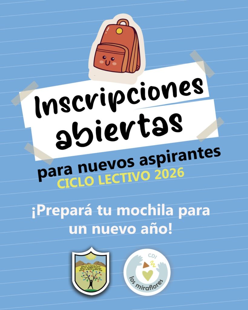 Las Escuelas EPA 12 “Manuel G. Ferré”, EPA 13 “Esther del Rosario Guevara”, EPA 14 “Martin Luther King y CDI “Los Miraflores” informaron que ya están abiertas las inscripciones para el Ciclo Lectivo 2026 de los nuevos aspirantes