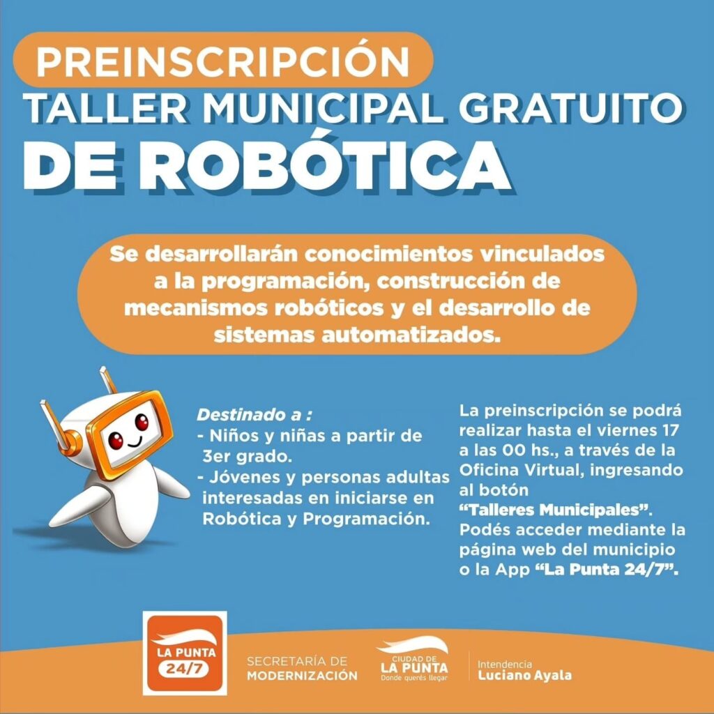 El taller está dirigido a niños y niñas a partir de tercer grado, así como también a jóvenes y adultos que deseen iniciarse en robótica y programación. Quienes estén interesados podrán preinscribirse hasta el viernes 17 a las 00 horas, a través de la Oficina Virtual del municipio, ingresando a la sección “Talleres Municipales”, ya sea desde la página web oficial o mediante la aplicación “La Punta 24/7”.