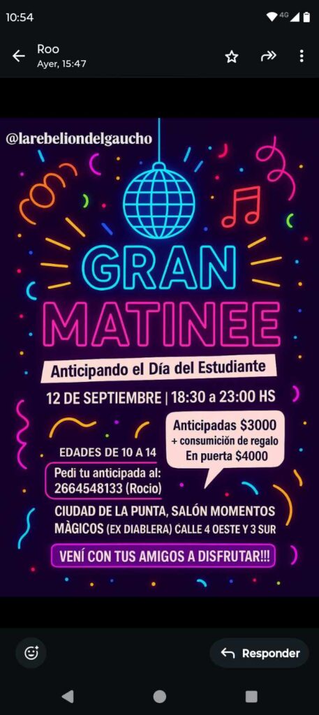 de 18:30 a 23:00 HS para jóvenes hasta 14 años a realizarse en Salón Momentos Mágicos (Ex Diablera) en Calle 4 Oeste y 3 Sur