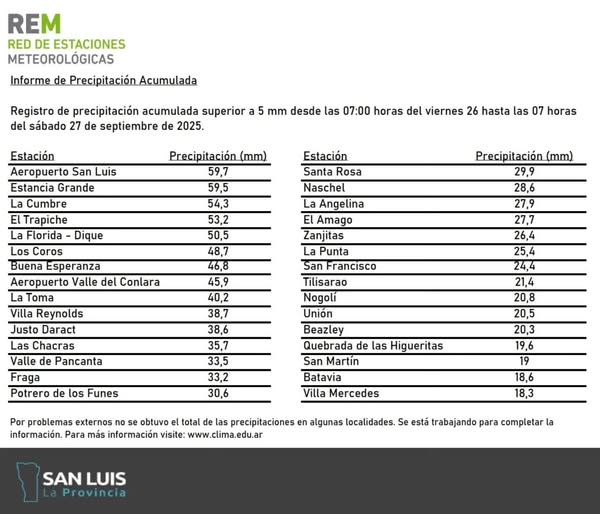 La lluvia hizo presencia en casi toda la provincia por info-vdlp · Publicada 27 septiembre, 2025 · Actualizado 28 septiembre, 2025 Vecinos De La Punta / 27 de setiembreLa ciudad de San Luis fue la más beneficiada con 59,7 mm. Le siguieron Estancia Grande con 59,5 mm y La Cumbre con 54,3 mm.En La Punta llovió un poco más de 25 mm