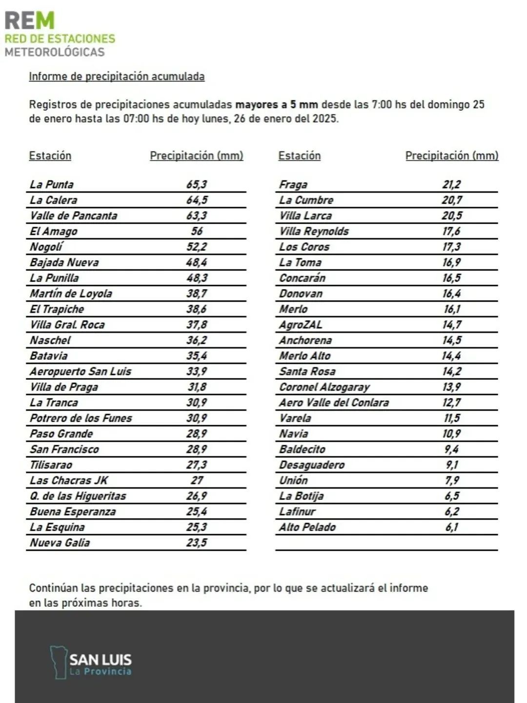 Vecinos De La Punta / 26 de enero Abundantes precipitaciones se dieron en toda la provincia, y La Punta no fue la excepción. Nada menos que 65.3 mm fueron los que cayeron en nuestra ciudad. Le siguieron La Calera con 64.5 mm y Valle de Pancanta con 63.3 mm.