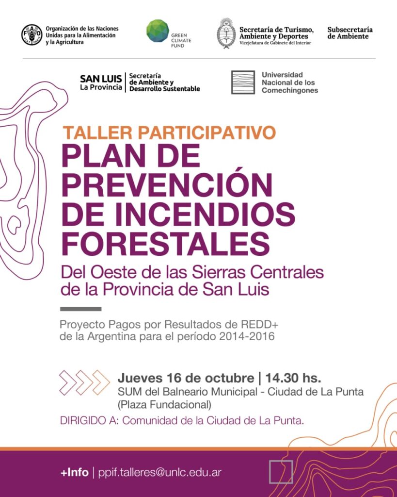 El jueves 16, a partir de las 14:30 y dirigido a toda la comunidad, el Salón de Usos Múltiples del Balneario Municipal de La Punta será sede del V Taller Participativo del PPIF de Sierras Centrales. Un esfuerzo de municipios del corredor oeste que permitirá la formulación de un plan de prevención de incendios forestales, clave para el cuidado de las comunidades y la biodiversidad a través de fondos internacionales.