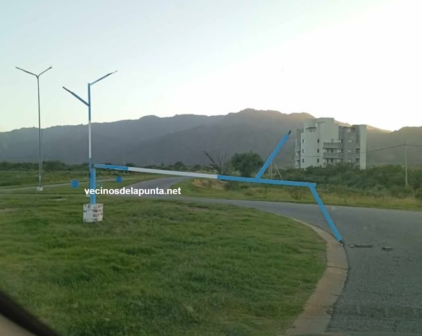Las fuertes ráfagas de viento que se produjeron durante la madrugada de este miércoles y que aún persisten en esta mañana, provocaron algunos destrozos en cartelerías, ramas de árboles, y en esta caso, tal como lo muestra la foto, en luminarias de la rotonda en Bulevar Las Cañadas y Avda. Serrana.