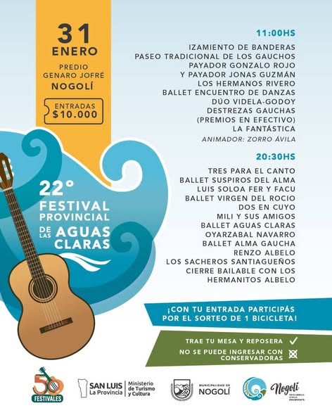 Nogolí será escenario del 22° Festival Provincial de las Aguas Claras, que se realizará el sábado 31 en el tradicional predio ‘Genaro Jofré’. La propuesta combina música, danza, tradiciones gauchas y naturaleza, un evento clave para el turismo y la cultura de la región.