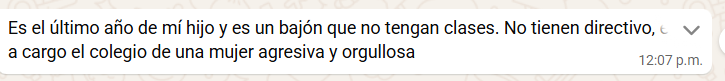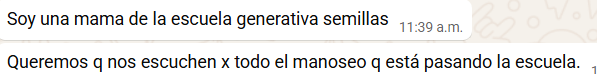 «Hoy la escuela no tiene directivos, no tiene nadie a cargo y solamente hay una sola persona, que es una secretaria que no tiene título alguno y que es de mal trato hacia los profesores y a los pares» contó una de las mamás a este medio. Y agregó que «pasaron cosas que no pudieron o supieron como abordarlo. Hoy, nuestros niños no tienen clase, no hay profesores, no hay directivo responsable y estamos en esta dinámica que nos sabemos para dónde vamos a ir».