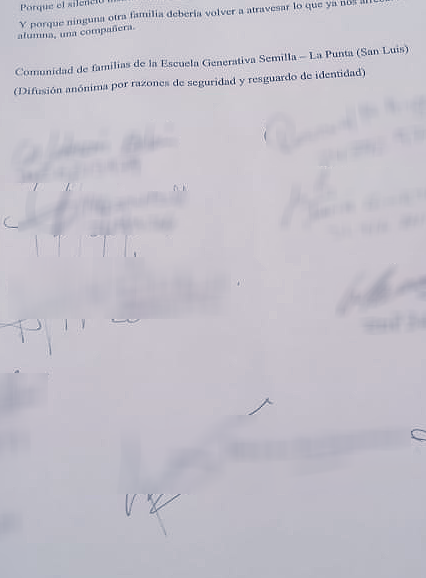 Padres y madres de la Escuela Generativa Semilla de La Punta, reclaman por cambio de autoridades y normalización de la institución educativa ante lo que denominan una «negligencia institucional» (falta manifiesta de preparación de los profesionales o ausencia de selección de personal adecuado) .