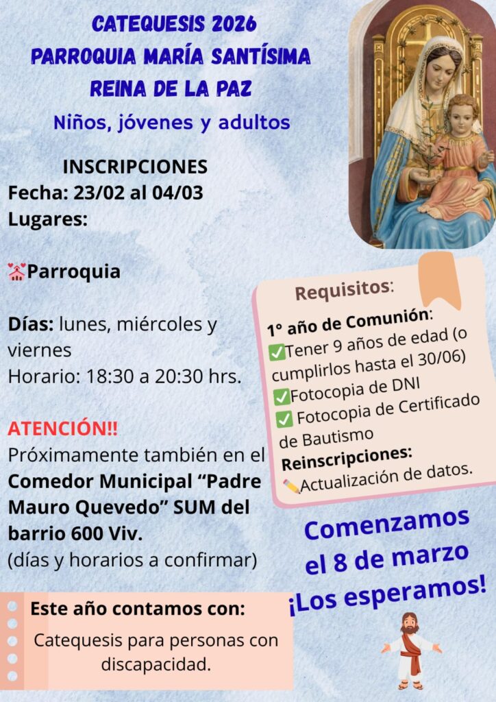 Parroquia María Santísima Reina de la Paz, La Punta, S.L informa que abren las inscripciones para la Catequesis 2026