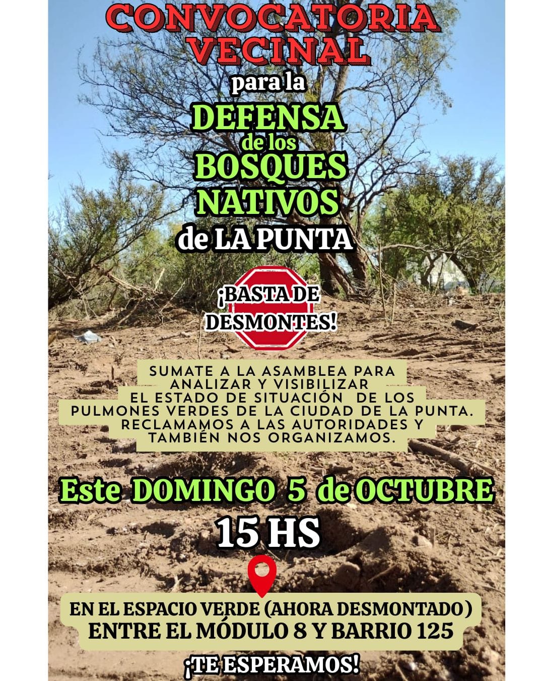 «SUMATE A LA ASAMBLEA PARA ANALIZAR Y VISIBILIZAR EL ESTADO DE SITUACIÓN DE LOS PULMONES VERDES DE LA CIUDAD DE LA PUNTA. RECLAMAMOS A LAS AUTORIDADES Y TAMBIEN NOS ORGANIZAMOS» reza la convocatoria realizada por un grupo de vecinos y ambientalistas.