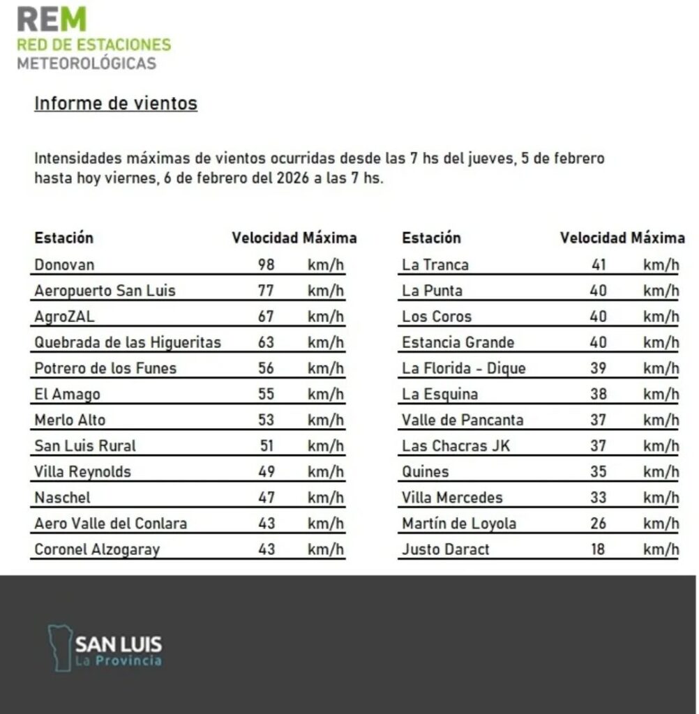Registro de vientos en la jornada de ayer por info-vdlp · Publicada 6 febrero, 2026 · Actualizado 7 febrero, 2026 VECINOSDELAPUNTA.NET / 06 DE FEBRERODónovan fue la localidad con ráfagas de hasta 98 km/hLa ciudad de La Punta, si bien tuvo ráfagas de menor intensidad, las mismas alcanzaron los 40 km/h