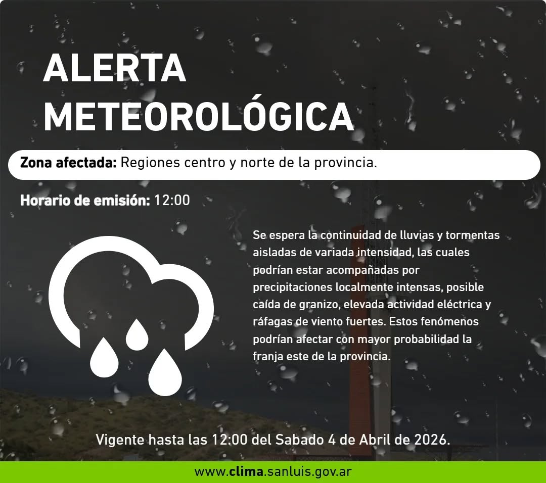 Se espera la continuidad de lluvias y tormentas aisladas de variada intensidad, las cuales podrían estar acompañadas por precipitaciones localmente intensas, posible caída de granizo, elevada actividad eléctrica y ráfagas de viento fuertes.