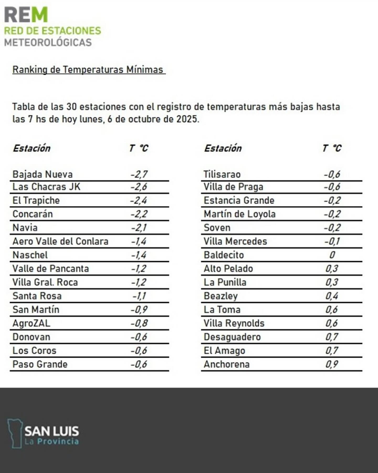 VECINOSDELAPUNTA.NET / 06 DE OCTUBRE Una mañana fría se da para varias localidades que algunas llegaron a temperaturas bajo cero, como en el caso de Las Chacras en Juana Koslay con -2.6 o El Trapiche -2,4 grados bajo cero. En La Punta, la mínima no llegó a bajo cero, fue de 2 grados cerca de las 3 am