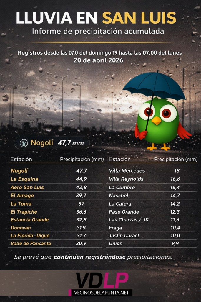También se destacaron otras localidades como El Amago (39,6 mm), La Toma (37 mm) y El Trapiche (36,6 mm), mientras que zonas como Estancia Grande, Donovan y La Florida (Dique) superaron los 30 mm.