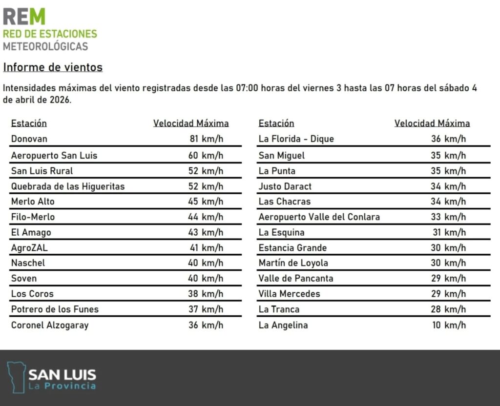 Se espera desde la madrugada del día sábado 4, la ocurrencia de vientos intensos provenientes del sector sureste. Se estiman velocidades entre 29 y 49 km/h con ráfagas de 70 km/h o superiores, en especial en el área serrana y zonas aledañas. Los departamentos con mayor probabilidad son: Pueyrredón, Chacabuco, Junín.